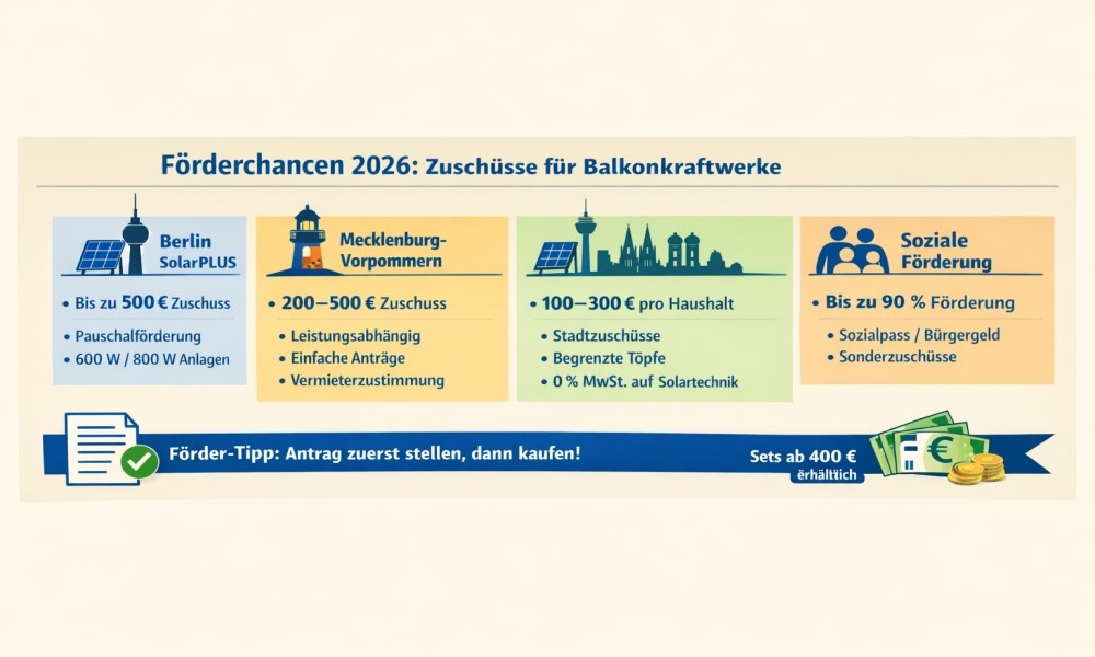 2026 fühlt sich an wie das Jahr, in dem die private Energiewende endgültig auf dem Balkon landet. Die Preise für Balkonkraftwerke sind so niedrig wie nie, viele Sets liegen inzwischen unter 400 Euro, und gleichzeitig öffnen Bund, Länder und Kommunen neue Fördertöpfe. Wer sich geschickt anstellt, kann seine Anlage heute fast zum Nulltarif installieren – zumindest in einigen Regionen.