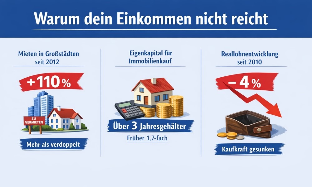 Wenn du heute in einer deutschen Großstadt zur Miete wohnst, merkst du schnell: Die Quadratmeterpreise sind seit 2012 im Schnitt um über 100 % gestiegen. Dein Gehalt? Nicht annähernd in diesem Tempo.